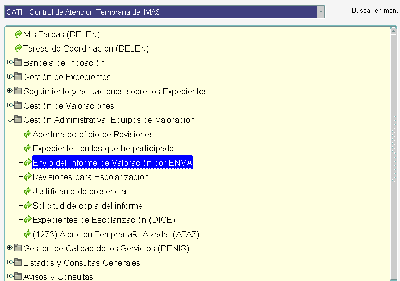 Para ello encontraremos en nuestro menú de CATI (dependiendo de nuestros permisos personales) dentro de sumenu de GESTION ADMINISTRATIVA EQUIPOS DE VALORACIÓN, la opción de Envío del Informe de Valoración por ENMA.