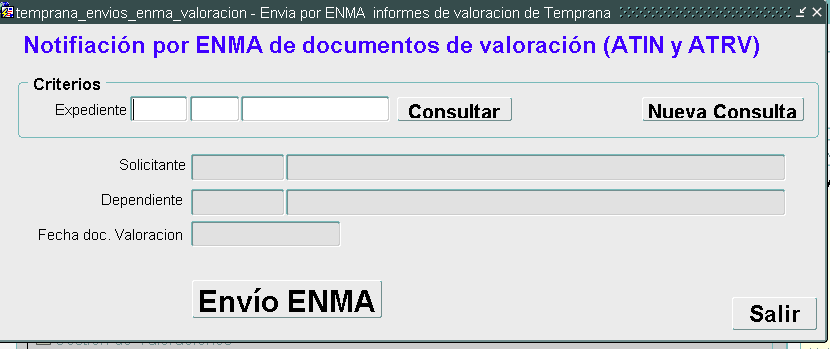 Al pulsar esta opción el sistema nos mostrará, una ventana donde nos solicitará el expediente ATIN o ATRV del que queremos enviar su informe. Introduciremos el expediente que deseamos y pulsaremos la tecla CONSULTAR.