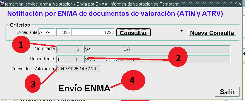 Superados estos requisitos, el sistema nos mostrará los datos correspondientes al expediente seleccionado (1) Dni y nombre del solicitante progenitor o tutor (destinatario del envío ENMA), (2) identificador y nombre del niño/a, (3) Fecha de la firma y hora de la firma del informe.