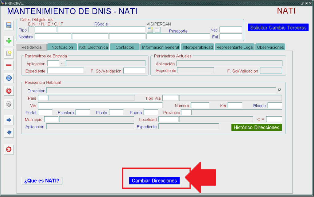 Para aquellos gestores que tienen permiso para cambiar a través de CAMBIOS A TERCEROS los datos básicos de NATI también encontrarán en sus menú o botones de gestión la posibilidad de cambio de direcciones de residencia, notificación o modo de notificación. Las encontraremos en las siguientes aplicaciones y pantallas:
